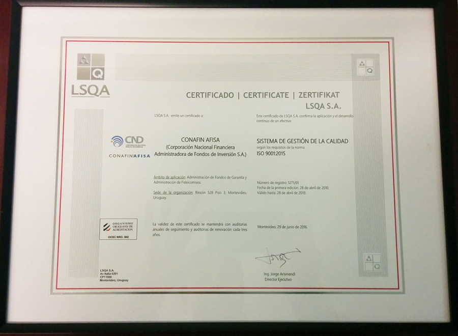 Conafin Afisa recibió de parte de LSQA y Quality Austria los certificados correspondientes a la certificación 2016 del Sistema de Gestión de Calidad bajo la norma ISO 9001:2015.